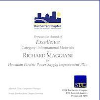 The year has started on a positive note. The Rochester Chapter of the Society for Technical Communication (STC) announced today that Solari Communication and its Principal, Rich Maggiani, won an Award of Excellence for the Power Supply Improvement Plan (PSIP) we wrote and edited for Hawaiian Electric Company. Judges has this to say about the plan: “comprehensive, detailed, well written; good mix of tables and figures that support readability.”